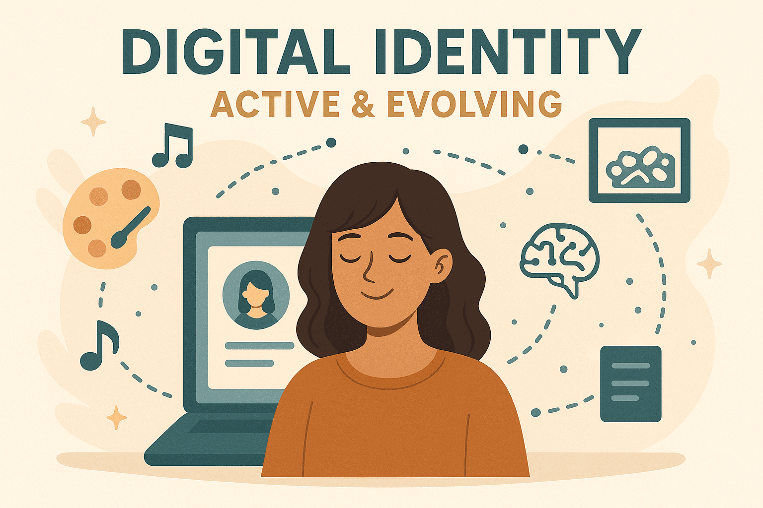 This picture depicts that shift in attitude. The calm expression on my digital character represents the feeling of control I gained by creating my own personal website and taking ownership over how I present myself online. The digital profile on the laptop symbolizes the more curated parts of my identity, while the floating icons in the background like the music notes, art palette, and brain symbol, represent the creative aspects of myself.